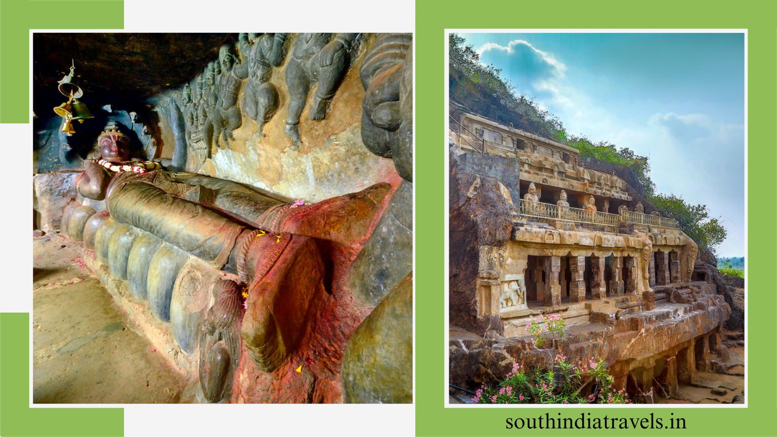 Solid sandstone rock-cut caves, located in Undavalli, 22 km northeast of Guntur City on a hillside, include a huge, recreated statue of Vishnu in a highly reclining posture.